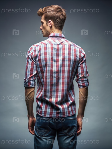 Молодой человек в красно-синей платовой рубашке стоит спиной к камере