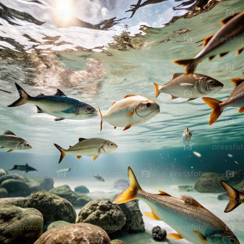 Подводный вид рыб, плавающих возле коралловых рифов в чистой воде