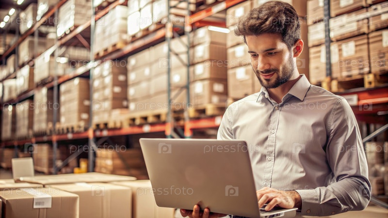 Менеджер по дистрибуции работает на ноутбуке в складе. генеративный ИИ