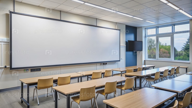 Пустой класс с большим экраном проектора и деревянными столами