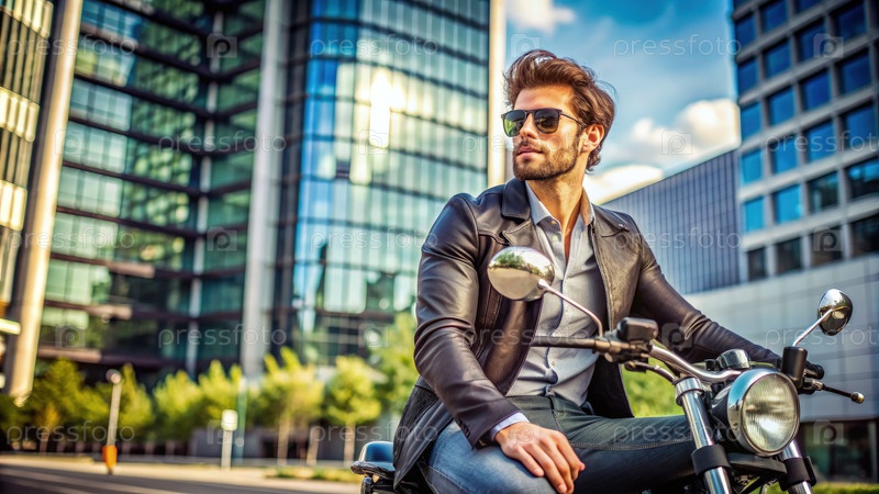 Человек в солнцезащитных очках сидит на мотоцикле в городской обстановке