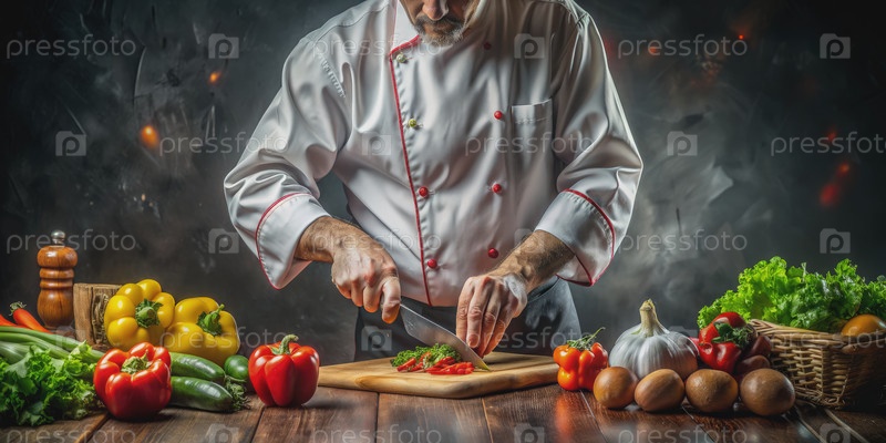 Профессиональный шеф-повар вырезает помидоры в темной кухне