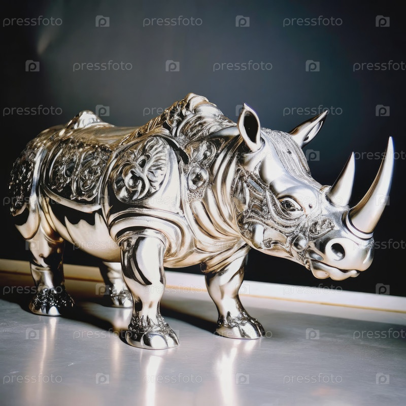 Украшенная серебряная скульптура носорога стоит на полированной поверхности