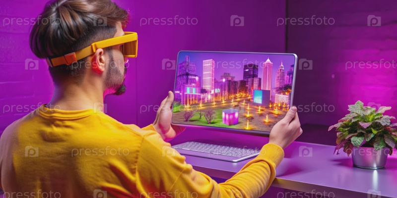 Человек испытывает дополненную реальность городской пейзаж на технологической конвенции