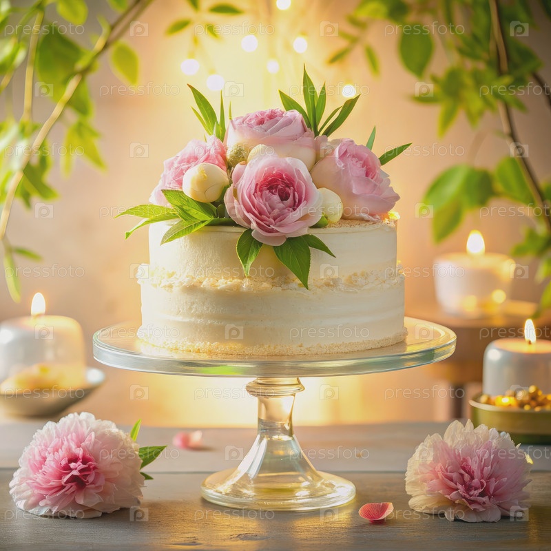 Двухуровневый ванильный торт, украшенный розовыми розами на стеклянной стойке