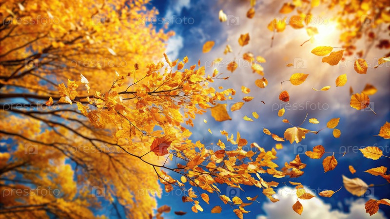 Золотые листья, вращающиеся в осеннем бризе в солнечный день