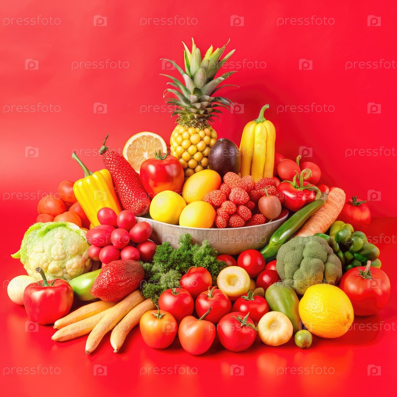 Красочные свежие фрукты и овощи в миске на красном фоне