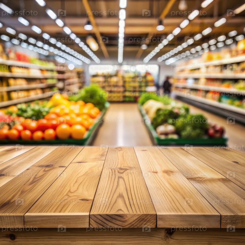 Пустой деревянный столешничный стол в размытом проходе супермаркета
