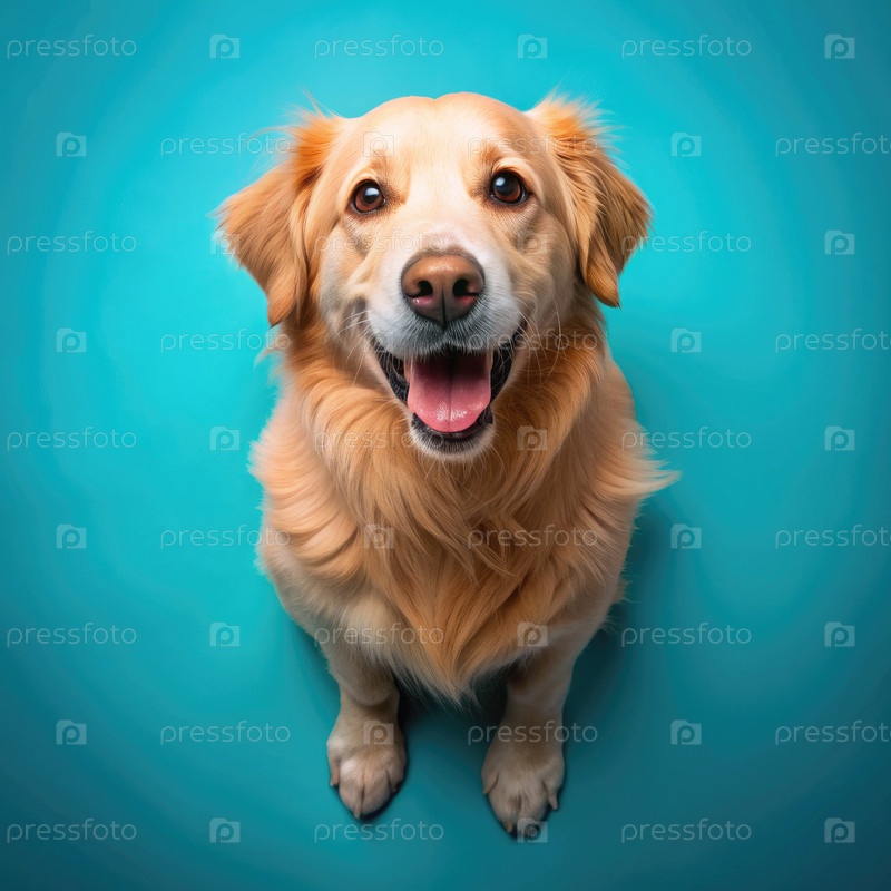 Счастливый золотистый ретривер сидит на голубом фоне