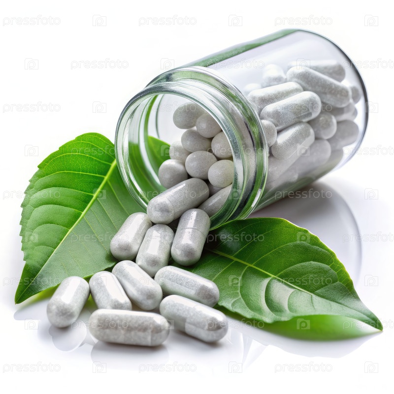 Белые минеральные добавки магния разлились из стеклянной банки на зеленые листья