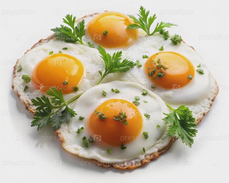 Четыре жареных яйца с петрушными украшениями на белой тарелке