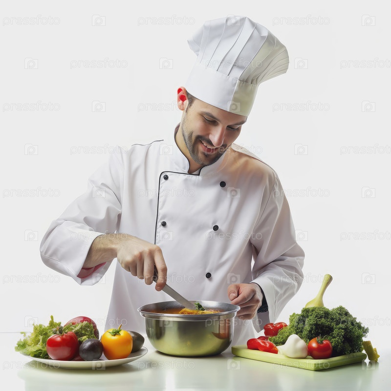 Улыбающийся шеф-повар смешивает суп на белой кухне