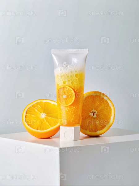 Витамин С, пену для мытья лица с оранжевыми ломтиками на белом фоне
