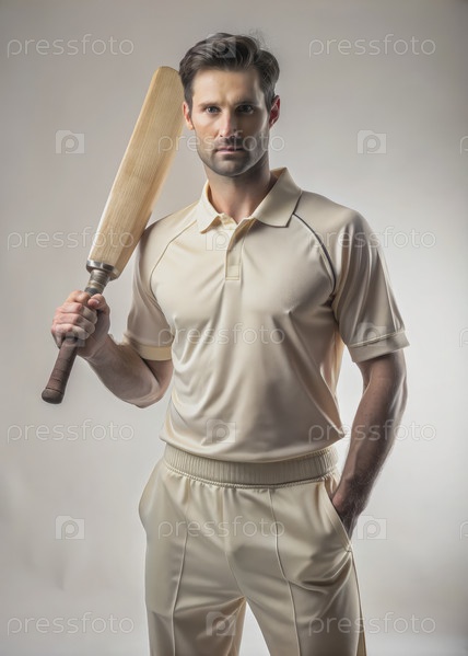 Европейский игрок крикета держит биту в белой форме на сером фоне