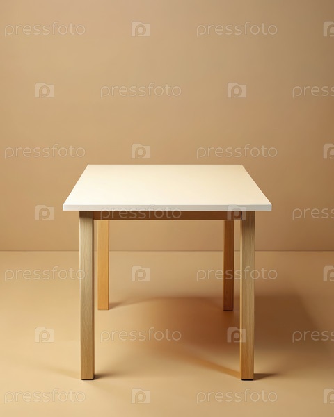 Белый квадратный стол с деревянными ногами на бежевой стене