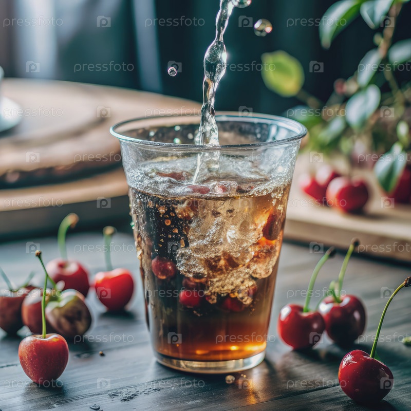 Освежающий вишневый чай с льдом в прозрачной пластиковой чашке на деревянном столе