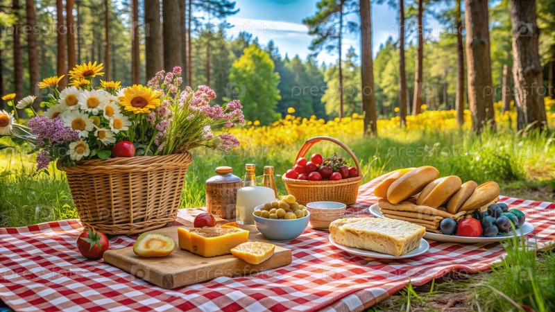 Установка деревенского пикника с разнообразными продуктами питания в лесном расчистке в солнечный день
