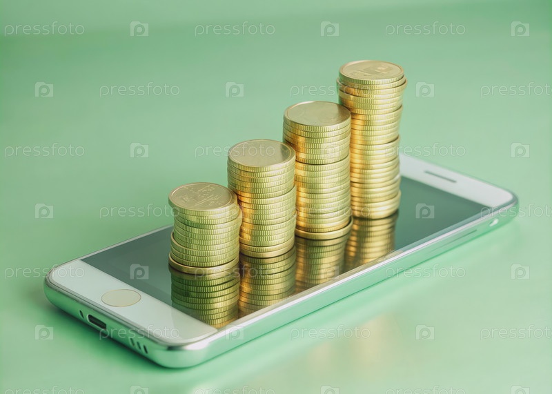 Золотые монеты, наложенные на смартфон на зеленом фоне