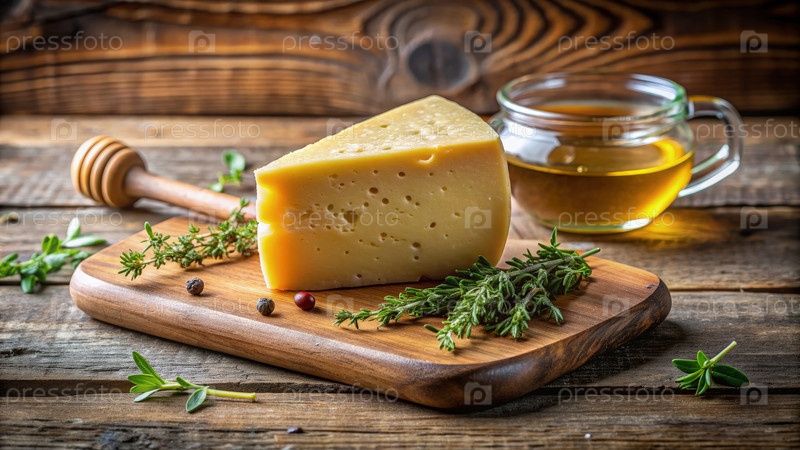 Элегантный сырной козырь натюрморт с медом и травами на деревянном дереве