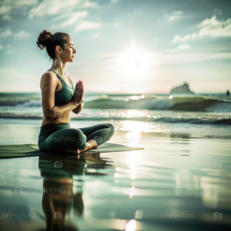 Молодой спортсмен практикует йогу на пляже при закате солнца
