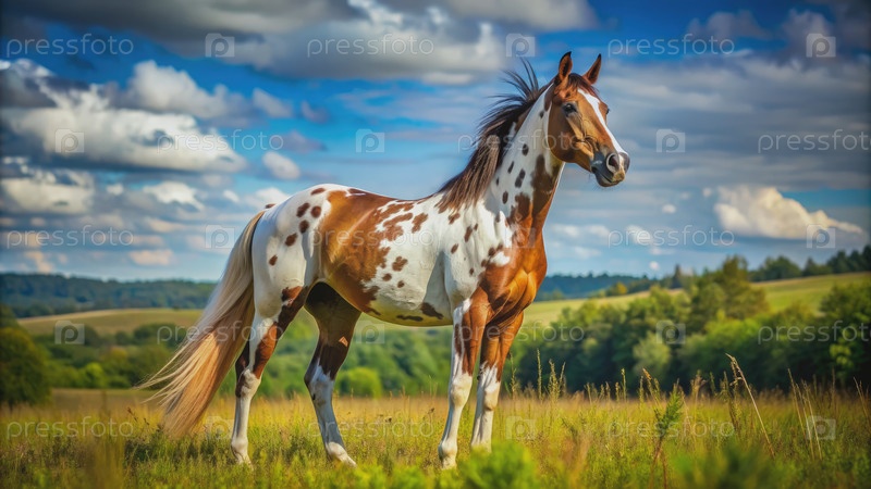 Пятнистый конь, стоящий на зеленом поле в солнечный день