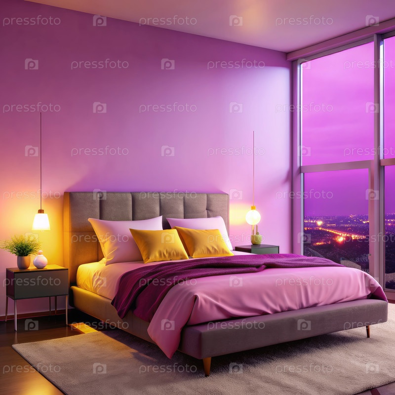 Интерьер спальни с городскими огнями ночью. генеративный современный ИИ