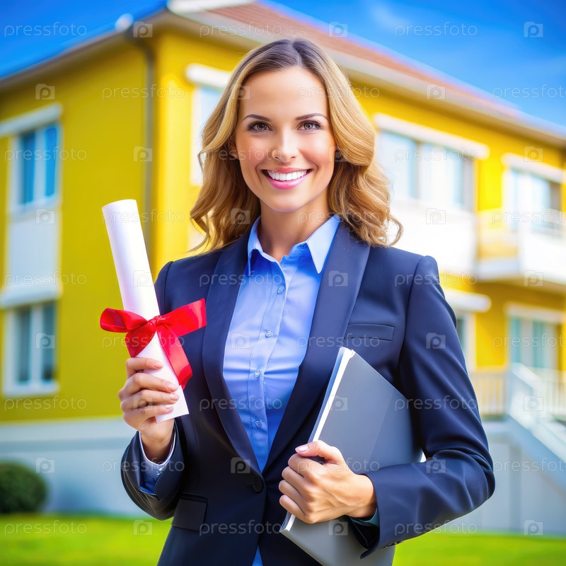 Успешный современный риэлтор, держащий диплом и ноутбук перед желтым домом