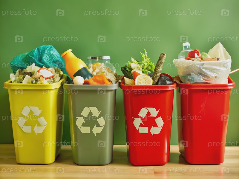 Четыре стандартных контейнера для переработки, заполненные разделенными отходами против зеленой стены
