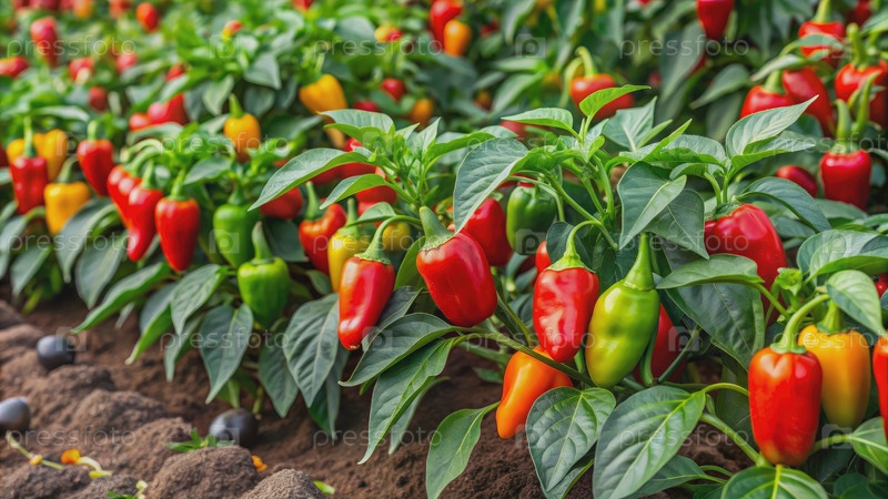 Зрелые красные перец, растущие в садовом ряду. генеративный ИИ