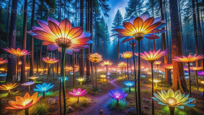 Инсталляция освещенных цветов в лесном огороде ночью. генеративный ИИ