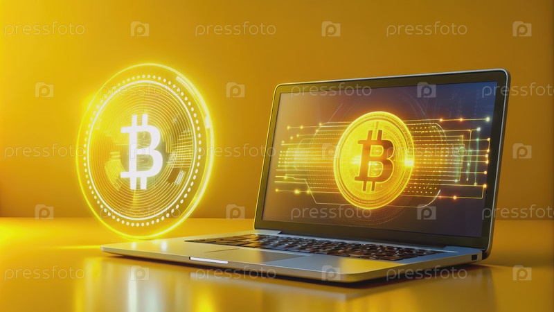 Цифровая голограмма Биткойна, плавающая над ноутбуком на желтом столе