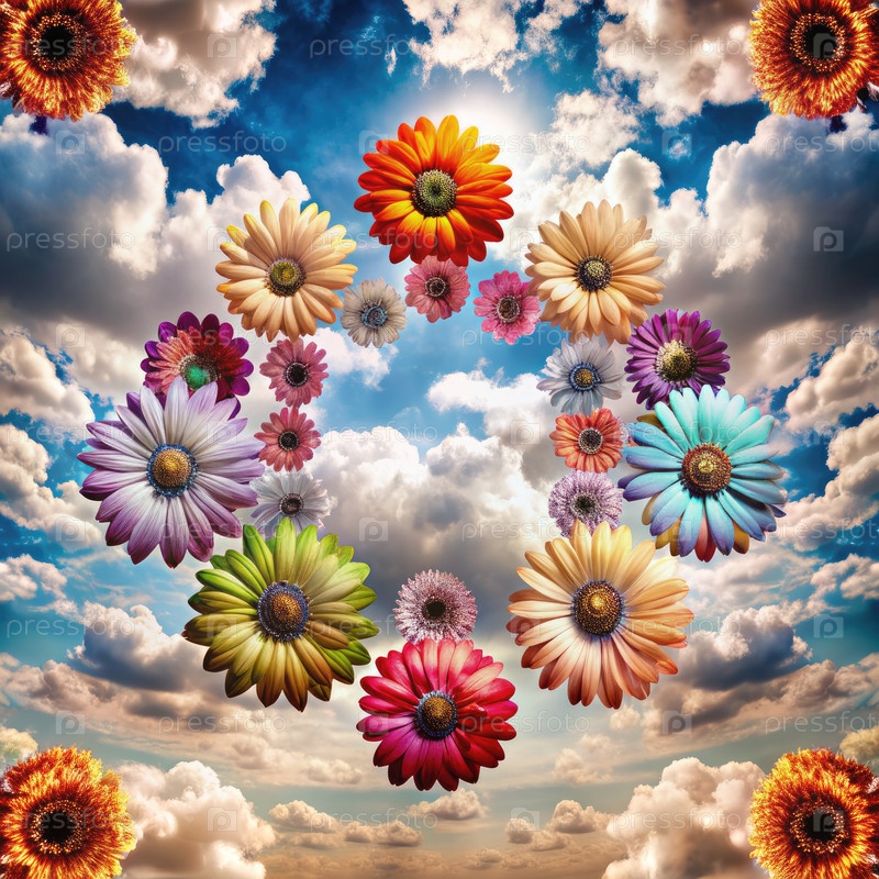 Цветные ромашки плавают в солнечном небе