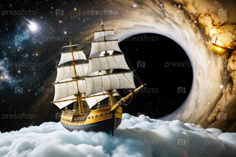 Причудливый корабль плывет через космические облака возле черной дыры