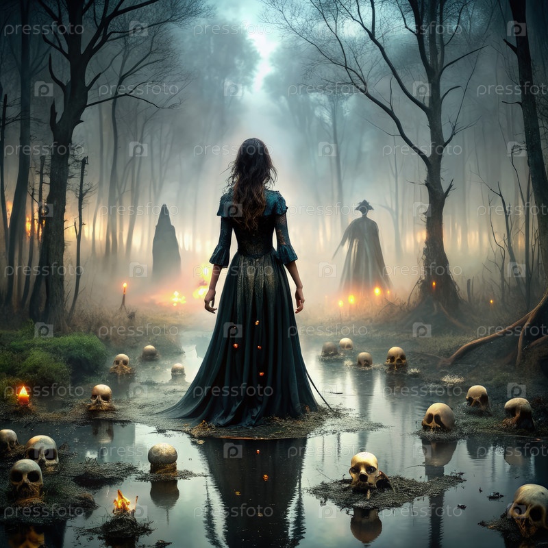 Ведьма ходит по туманному болоту с черепами, разбросанными вокруг нее