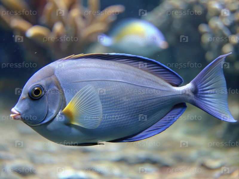 Близкий взгляд на рыбу голубого танга, плавающую в тропическом аквариуме