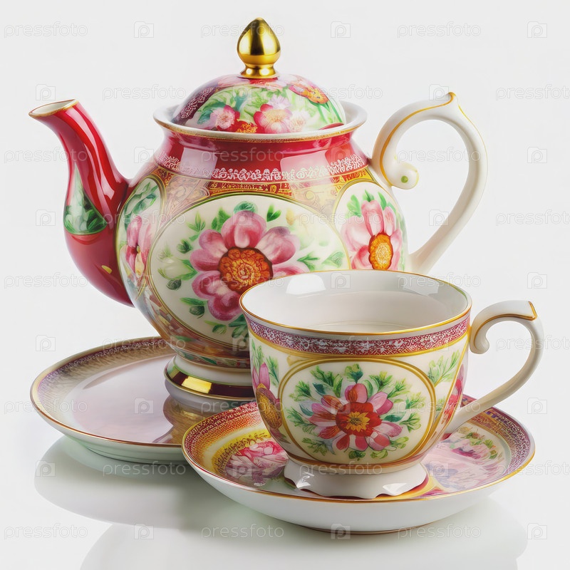 Красочный фарфоровый чайник и чашечка, установленные на белом фоне
