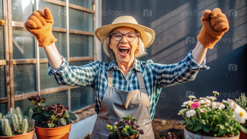 Энтузиастический старший садовник празднует успех в своем заднем дворе