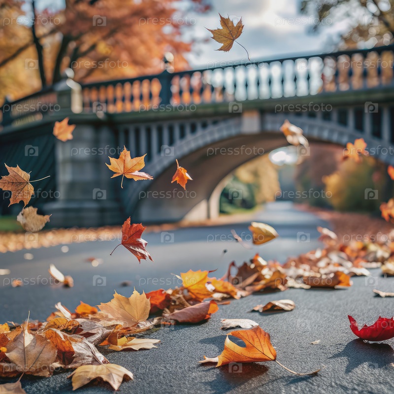 Осенние листья падают возле паркового моста