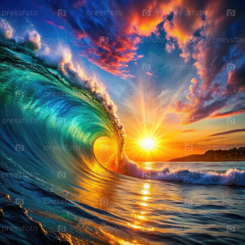 Красочный закат солнца над большой разрывной волной в океане