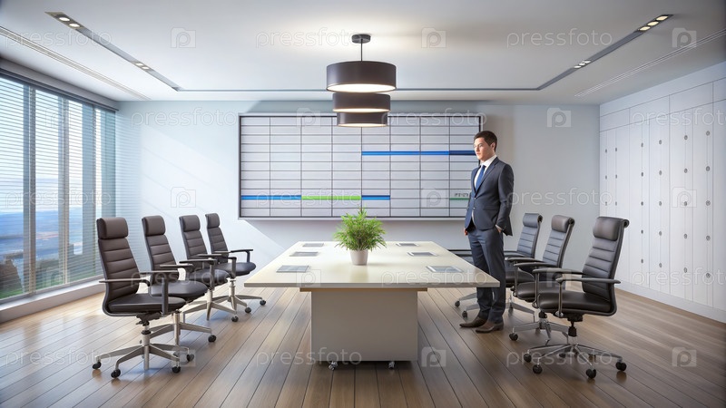 Координатор проекта просматривает график Ганта в современном офисном конференц-зале