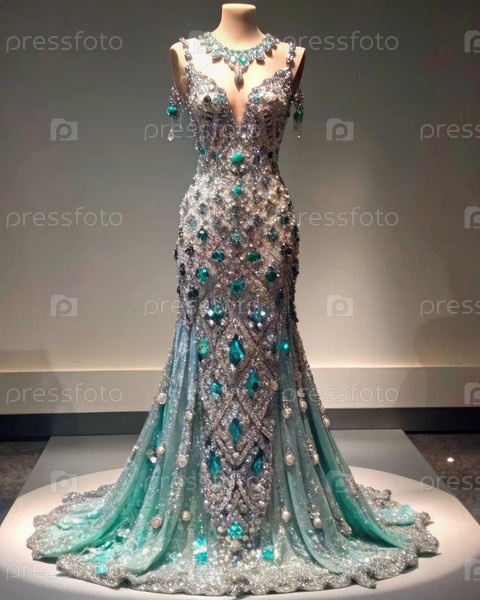 Окрашенное в бусы изумрудно-зеленое платье, выставленное на манекене в музее