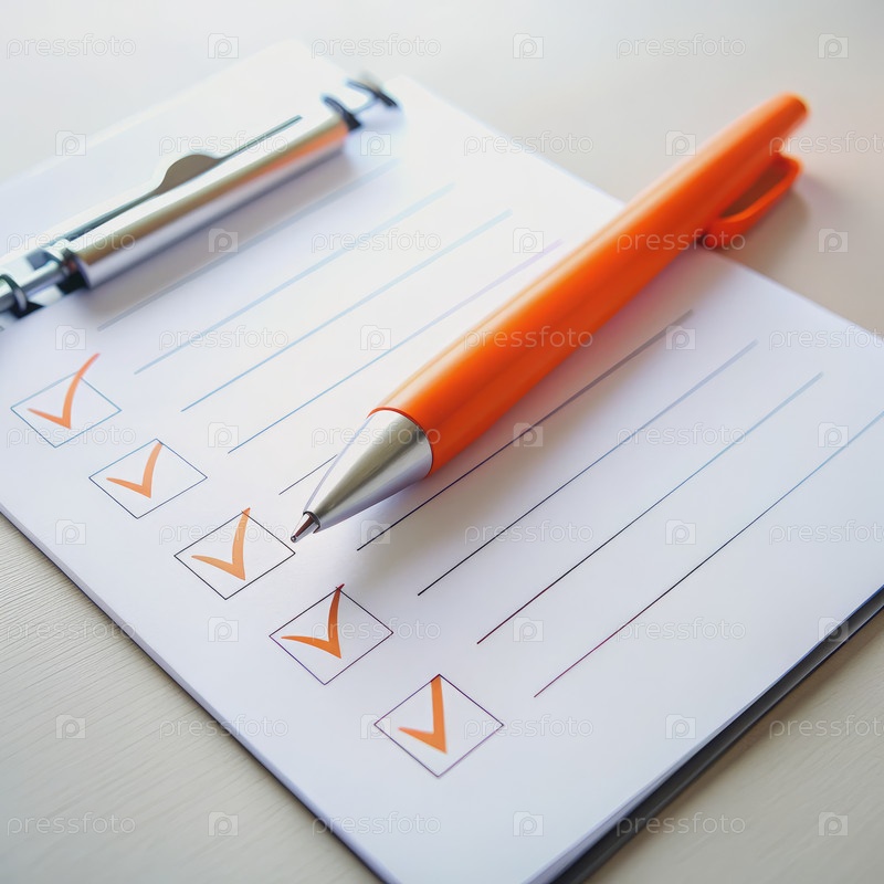 Контрольный список с оранжевой ручкой на белом столе