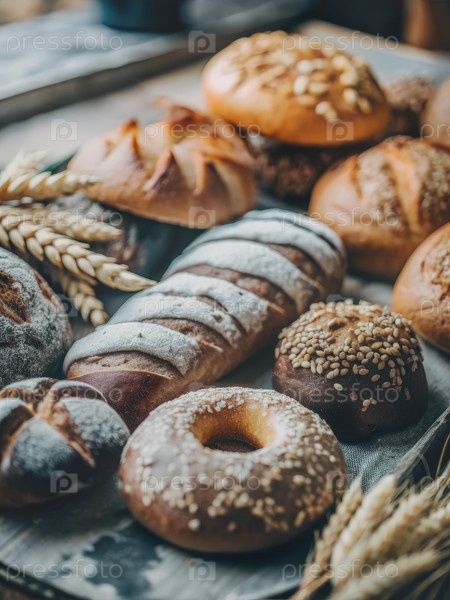 Асортимент свежевыпеченного хлеба на деревянном рустическом столе