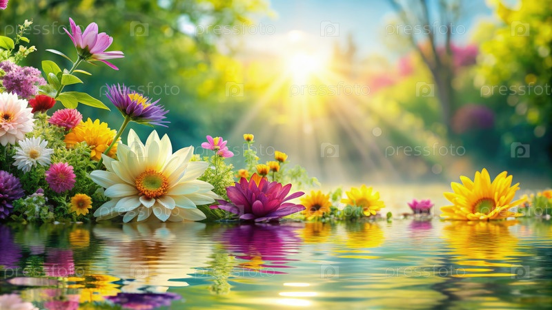 Красочные летние цветы отражаются в неподвижной воде
