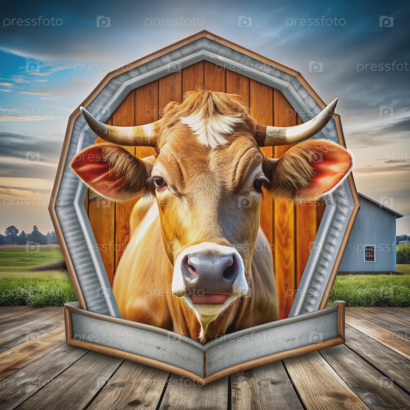 Близкий портрет коричневой и белой коровы в рамке двери амбара