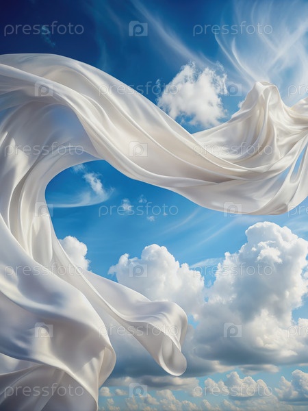 Белая шелковая ткань блестит в голубом небе с облаками