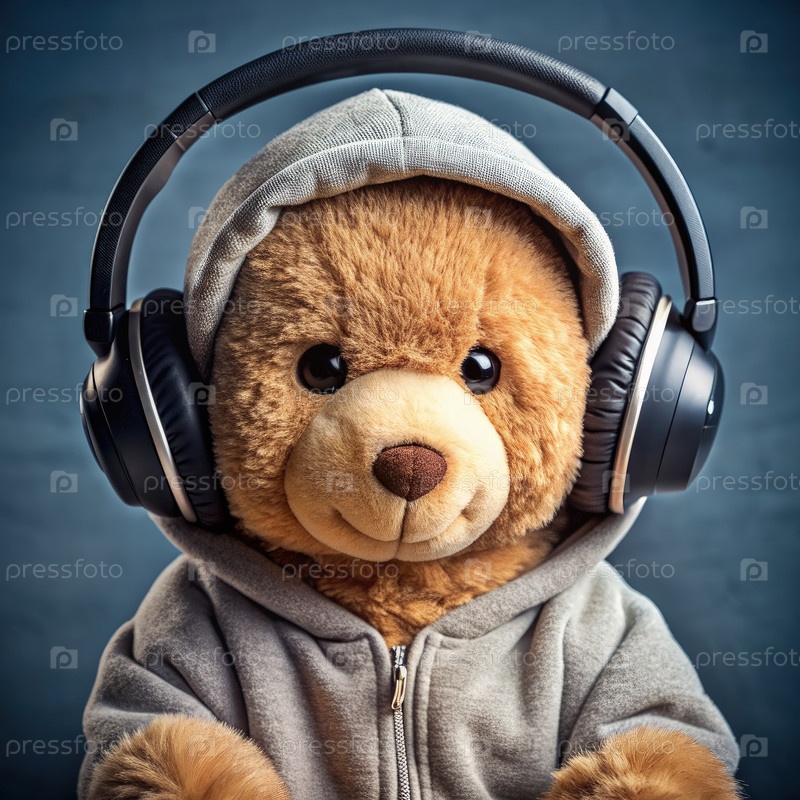 Медведь с капюшоном, носящий наушники слушает музыку