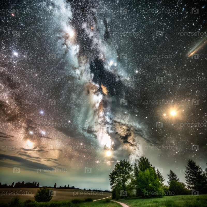 Галактика Млечного Пути над сельским полем и деревьями ночью