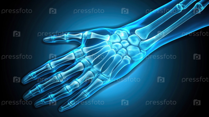 Цифровое рентгеновское изображение человеческой руки, показывающее кости запястья и предплечья