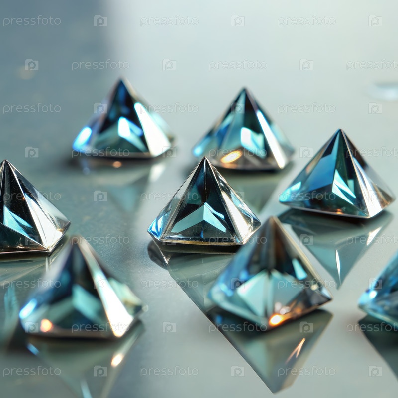 Ближайшее изображение голубых треугольных драгоценных камней на отражающей поверхности